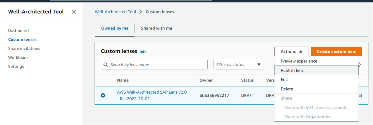 After this, the SAP Lens will show in draft state, so go ahead and publish it. After publishing the SAP Lens, you can use it for Well-Architected Reviews.