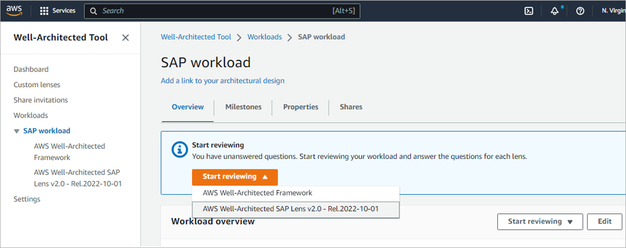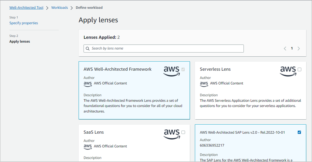 The SAP Lens is now associated with your workload. When you do the workload review, remember to select the SAP Lens, as shown below.