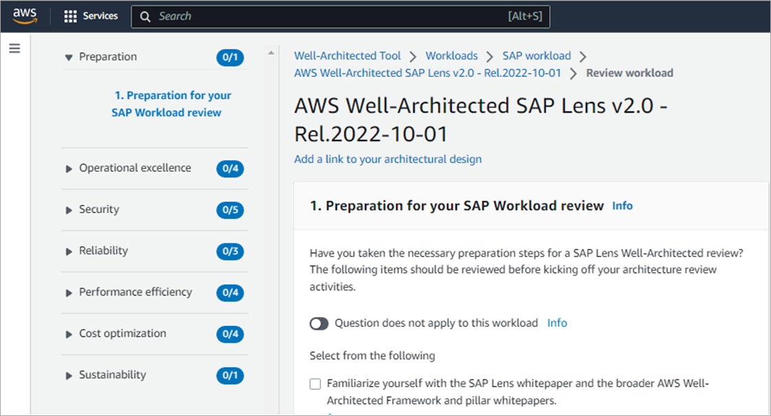 The SAP Lens can be imported in a JSON file-based import into the Well-Architected Tool. This makes the review easier than a document-based review, and it’s recommended to perform the review using the Well-Architected Tool
