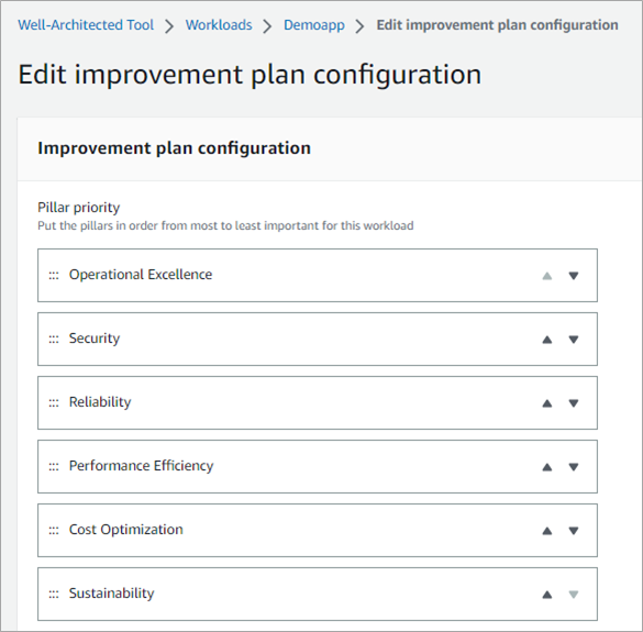 To set the pillar priority, go to the AWS Well-Architected Tool > Workloads > workload-name > Pillar priority > Edit.