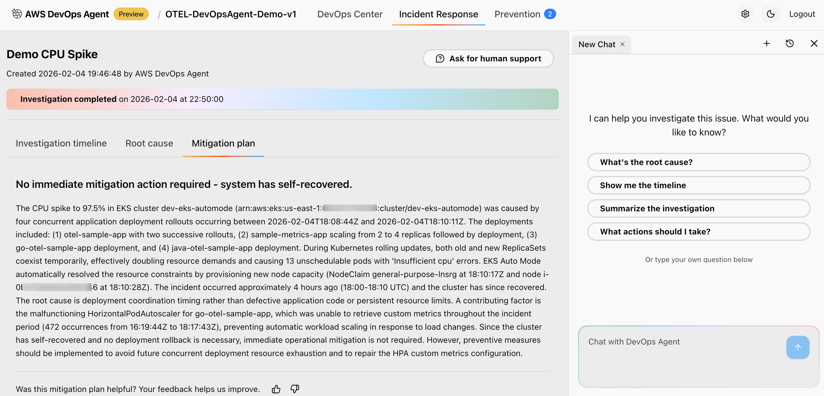 What you should observe: Once the test begins, the AWS DevOps Agent detects the deviation from the established baseline and initiates an investigation. In the agent’s incident response view, you will see the following outcomes: