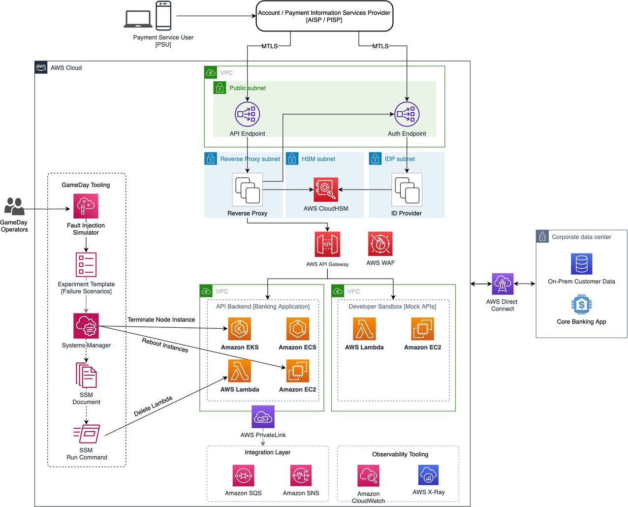 Figure 1 shows a reference architecture example that demonstrates conducting a game day for an Open Banking implementation.