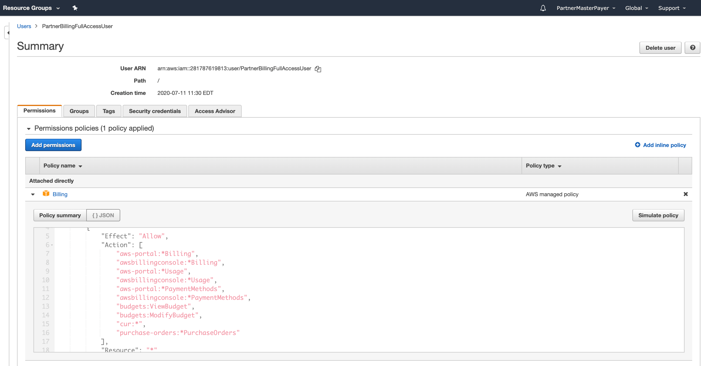 7. Create an IAM role/user for Partner billing role in the Partner Master Payee account.