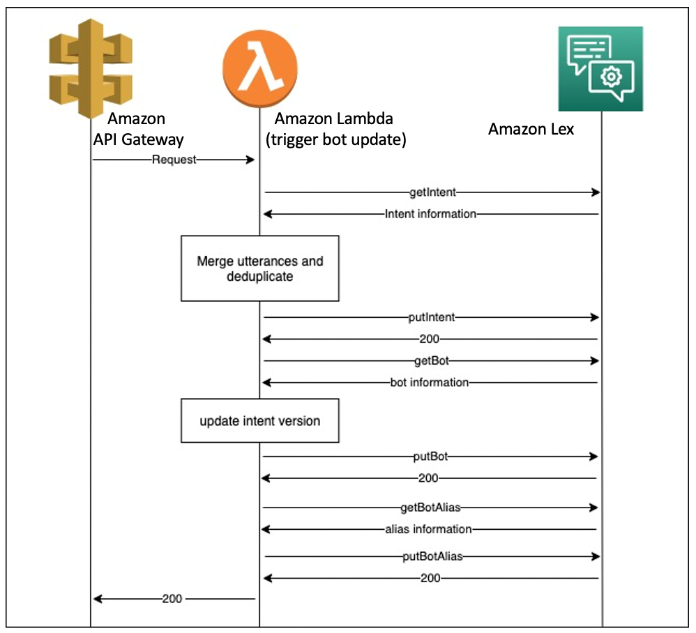 The core logic for updating the bot is contained in a Lambda function that triggers the Lex update. This adds new utterances to an existing bot, builds it and then publishes a new version of the bot. The Lambda function is associated with an API Gateway endpoint which is called with the following body: