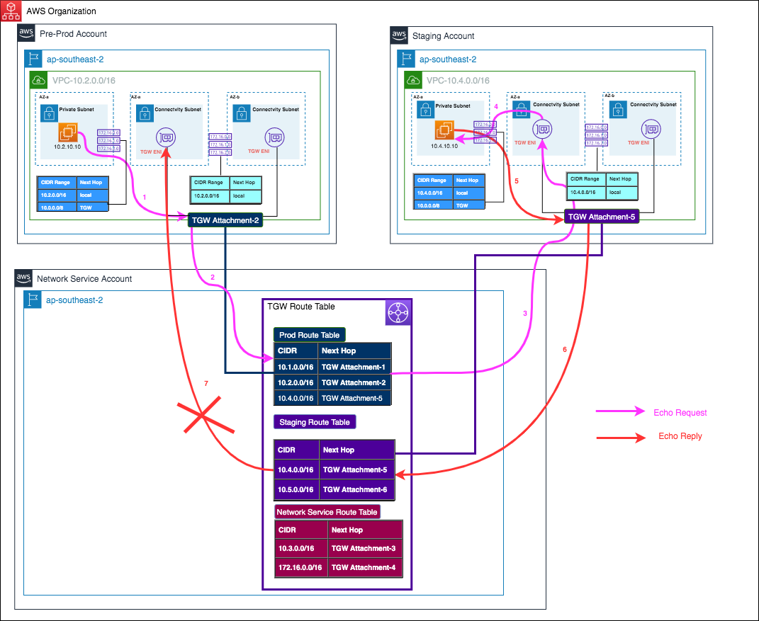 - Echo-Reply packet is evaluated against the Staging Transit Gateway route table and it does not have route for the destination network 10.2.0.0/16. The packet is not forwarded to Pre-Prod VPC.