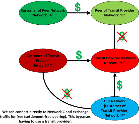 Complicating the above traffic engineering operations is that you are not the only person on the Internet trying to push traffic to certain destinations. Other networks are also in a similar position where they’re trying to deliver traffic and will perform their own traffic-engineering. There are also many networks that will refuse to peer with other networks for several reasons. For example, some networks may cite an imbalance in in vs. outbound (traffic ratios) or feel that traffic is being dumped on their network. In these cases, the only way to reach these destinations is via a transit provider. In some cases, these networks may offer a “paid peering” product to provide direct connectivity. That paid peering product may be priced at a value that is lower the price of what you would pay for transit or could offer an uncongested path that you’d normally observe over transit. Just because you have a path via transit doesn’t mean the path is uncongested at all hours of the day (such as during peak hours).