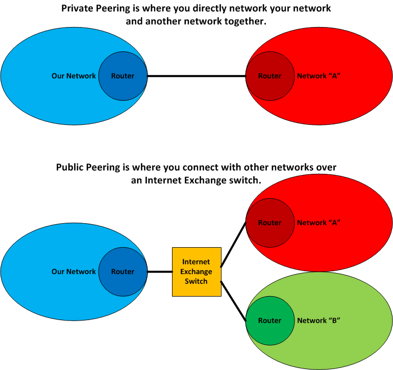 Peering is where an autonomous system will connect to another autonomous system and agree to exchange traffic with each other (and routing information) of their own networks and any customers (transit customers) they have. With peering, there are two methods that connectivity is formed on. The first is where direct connectivity is established between individual networks routers with multiple 10Gigabit Ethernet or 100Gigabit Ethernet links. This sort of connectivity is known as “private peering” or PNI (Private Network Interconnect). This sort of connection provides both parties with clear visibility into the interface utilization of traffic in both directions (inbound and outbound). Another form of peering that is established is via Internet Exchange switches, or IX’s. With an Internet Exchange, multiple networks will obtain direct connectivity into a set of Ethernet switches. Individual networks can establish BGP sessions across this exchange with other participants. The benefit of the Internet Exchange is that it allows multiple networks to connect to a common location and use it for one-to-many connectivity. A downside is that any given network does not have visibility into the network utilization of other participants.
