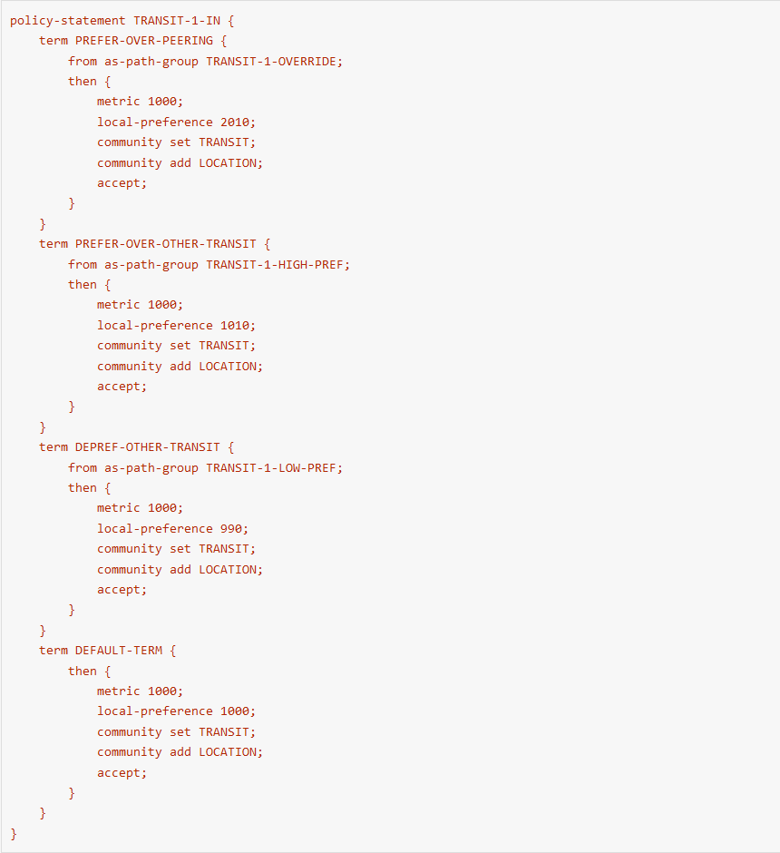 Routing policies themselves are defined on routers in a simple text-based policy language that is specific to the router operating system. They contain two types of functions: matching on one or multiple routes and an action for that match. The matching can include a list of actual IP prefixes and subnet lengths, ASN origins, AS-Paths or other types of BGP attributes (communities, next-hop, etc). The actions can include resetting BGP attributes such as local-preference, Multi-Exit-Discriminators (MED) and various other values (communities, Origin, etc). Below is a simplified example of a routing policy on routes learned from a transit provider. It has multiple terms to permit an operator to match on specific Internet routes to set a different local-preference value to control what traffic should be forwarded through that provider. There are additional actions to set other BGP attributes related to classifying the routes so they can be easily identified and acted upon by other routers in the network.