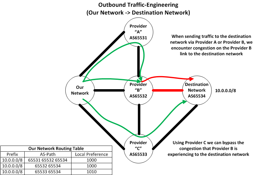 Network operators will tune their routing policy to determine how to send traffic and how to receive traffic through adjacent autonomous systems. This practice is generally known as BGP traffic-engineering. Making outbound traffic changes is by far the easiest to implement because it involves identifying the particular routes you are interested in directing and increasing the routing preference to egress through a particular adjacency. Operators must take care to examine certain things before and after any policy change to understand the impact of their actions.