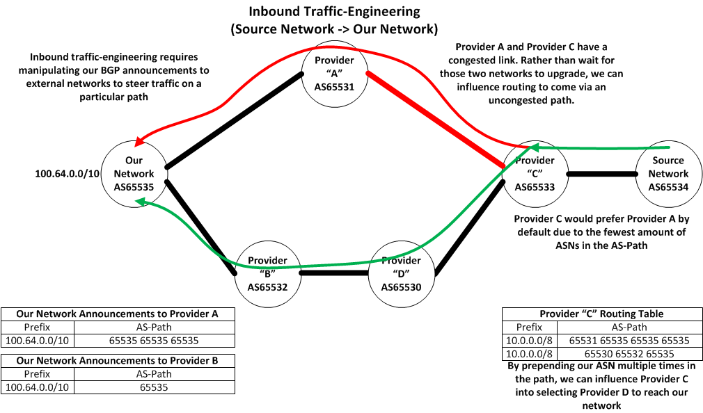 Inbound traffic-engineering is a bit more difficult as it requires a network operator to alter routing information announcements leaving your network to influence how other autonomous systems on the Internet prefer to route to you. While influencing the directly adjacent networks to you is somewhat trivial, influencing networks further beyond those directly connected can be tricky. This technique requires the use of features that a transit provider can grant via BGP. In the BGP protocol, there is a certain type of attribute known as Communities. Communities are strings you can pass in a routing update across BGP sessions. Most networks use communities to classify routes as transit vs. peer vs. customer. The transit-customer relationship usually gives certain capabilities to a customer to control the further propagation of routes to their adjacencies. This grants a network with the ability to traffic-engineer further upstream to networks it is not directly connected to.