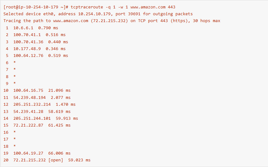 With the same traceroute using TCP/443 (HTTPS), we find multiple routers do not respond but the destination does respond since it is listening on TCP/443: