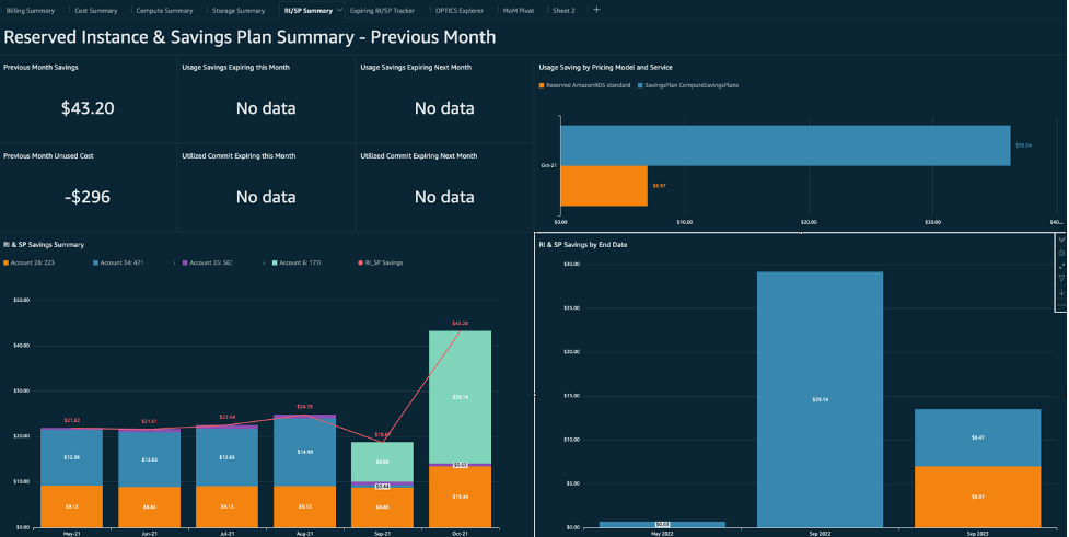 The Reserved Instance and Savings Plan Summary tab and Expiring RI/SP Tracker tab summarize the savings you’ve realized from using Reserved Instances and Savings Plan across all of your accounts independent from the services they were used for. It tracks where the savings came from (by grouping savings by Reserved Instance or Savings Plan type), where the savings were realized (by grouping savings by account, tag, cost category, service, etc.), and when those savings will expire. Your organization can use a savings amount as a KPI, and track how each team or business unit performs compared to your goals over time. You can also see the impact of letting these purchase options expire by visualizing the monthly savings each Reserved Instance of Savings Plan is realizing by expiration date.