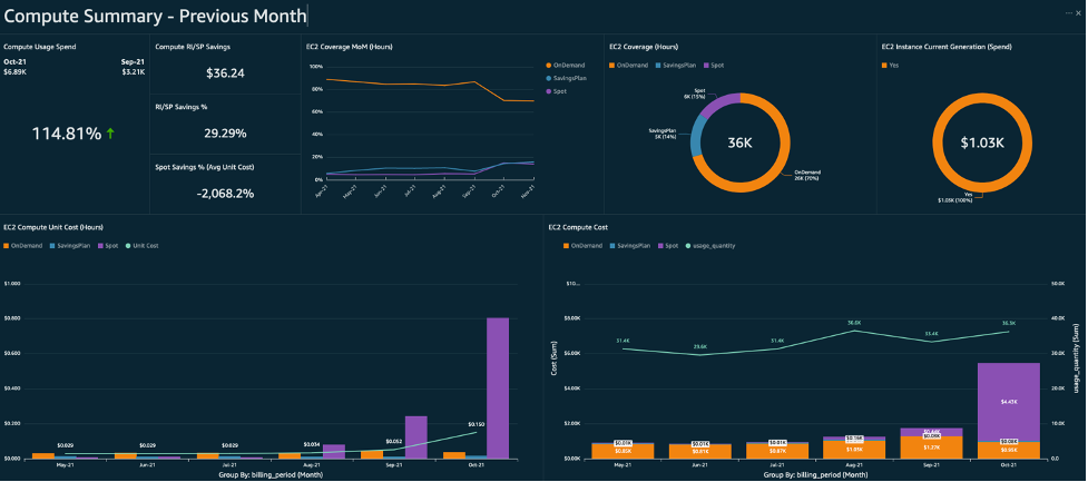 The Compute Summary tab is dedicated to trends, KPIs, and cost optimization for AWS Compute services such as Elastic Compute Cloud (Amazon EC2) and AWS Lambda. You can see what savings you realized last month using Reserved Instances, Savings Plan, and Spot Instances, and keep track of how they covered your Amazon EC2 hours over the course of time. You can also see how much money was spent last month on previous generation instances. By adopting policies and best-practices for using Savings Plans, Reserved Instances, Spot Instances, and current generation instances you can optimize your average, hourly cost of Amazon EC2. The unit cost of Amazon EC2 is a good CFM KPI to track using this dashboard.