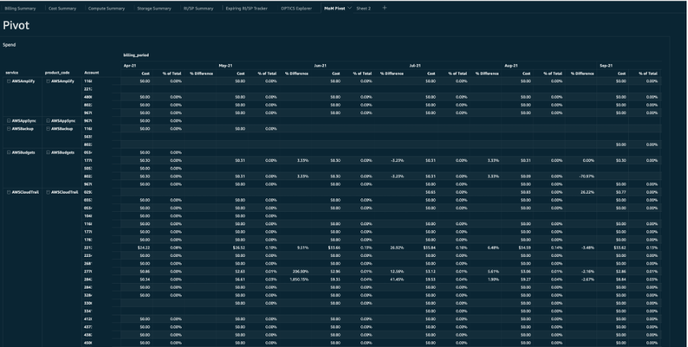 The MoM Pivot tab consists of two large pivot tables grouped by month; one is dedicated to spend and the other usage. These month-over-month pivot tables of all spend and usage can be used for financial reporting.