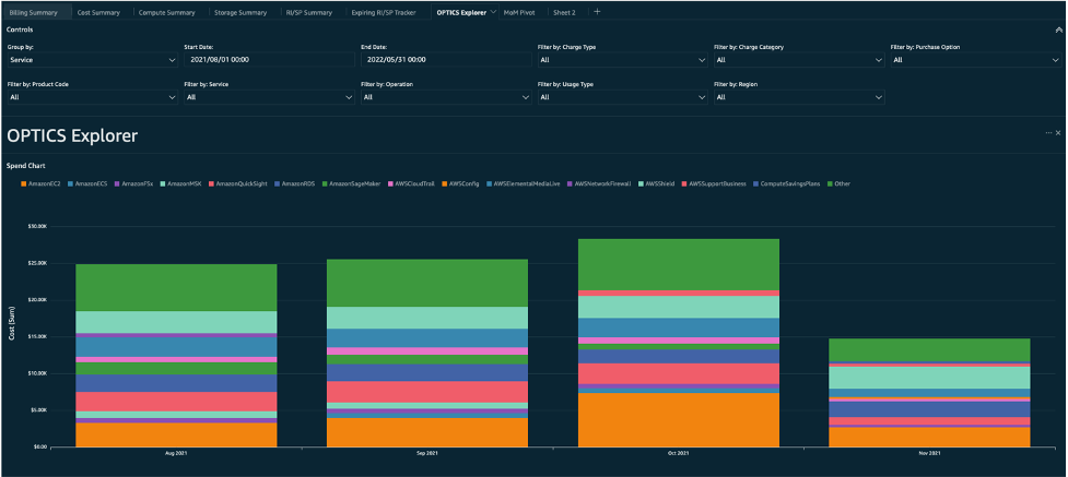The OPTICS Explorer tab is an ad hoc query tool built into the dashboard that allows you to make customized queries (by adding filters and group by arguments) of your cost and usage data. For example, you might use this tool to visualize your month-over-month spend on Relational Database Service (Amazon RDS) and group it by product family so you know how much of that spend was on storage.