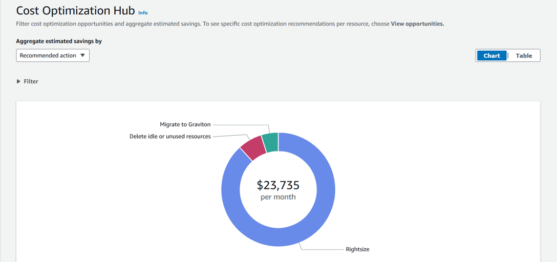 In Cost Optimization Hub, you will also find recommendations to identify idle Aurora DB instances. You can consider deleting these instances or converting them to Aurora Serverless v2 with auto-pause to save cost on unused resources. You’ll also find opportunities to migrate to Graviton and purchase Reserved Instances for Amazon Aurora to further help you optimize your fleet.