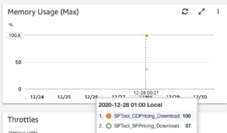 The ‘SPTool_SPPricing_Download’ function is only using 37% of its provisioned memory, therefore it may be worth reducing the allocated memory. This will then lower the cost when it runs.