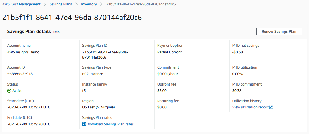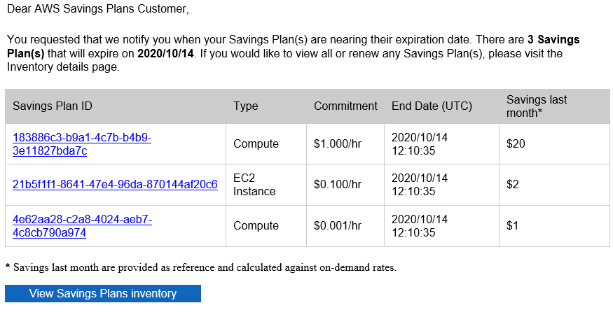 In your expiration alerts email, we will highlight all Savings Plans in your inventory that are about to expire based on your alert preferences. The email will provide you with the Savings Plan ID, Savings Plans Type, commitment amount, and savings from last month. Clicking on the Savings Plan ID will automatically take you to the Details page of that specific Savings Plan where you can see more detail.