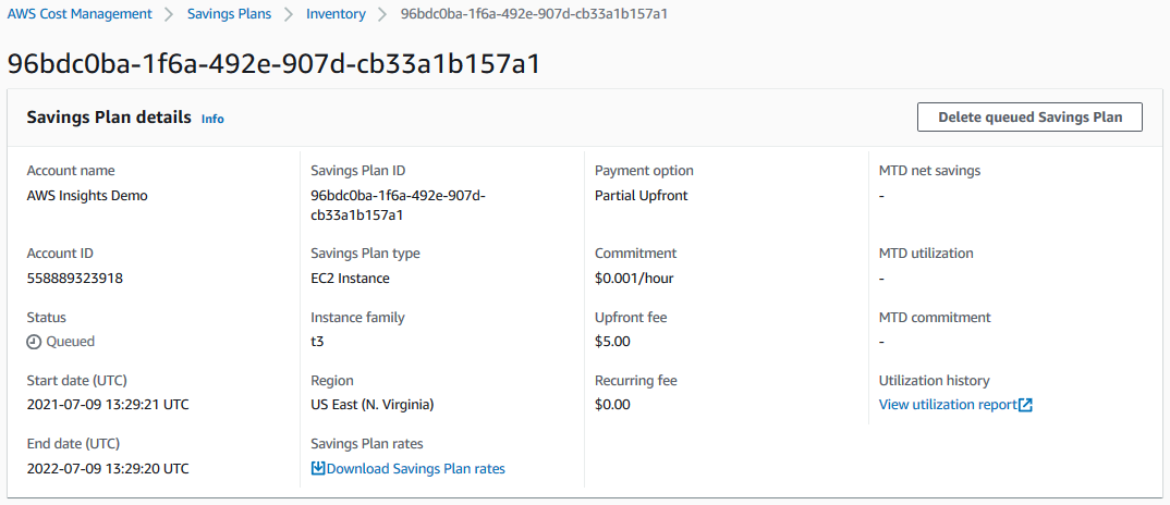In the Savings Plan details page, you can see more information about the specific Savings Plan. For example, if you have an EC2 Instance Savings Plan, you can also evaluate the Instance family and Region. Given that this is a queued purchase (which has not been purchased yet), you do not see any MTD metrics. From here, if you wish to delete the queued purchase, you can click on the “Delete queued Savings Plan” button and then click on “Delete” in the popup modal box to confirm. From here, you can queue a new Savings Plans queued purchase with the right commitment amount by following the Purchasing Savings Plans page in the user guide.