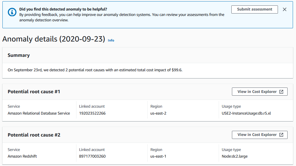 Root cause analysis: Regardless of how you configured your monitors, Anomaly Detection will attempt to pin point the root cause of the anomaly by indicating the Service, Account ID, Region, and Usage type that is driving that unusual spend increase. There may be multiple root causes occurring at once – in these cases, Anomaly Detection will provide the most prevalent two root causes.