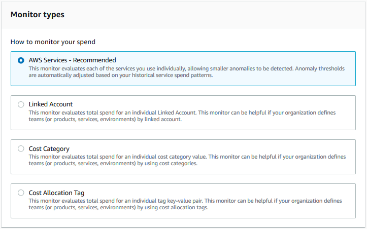 Customers let us know that they need to segment spend to not only manage budgets, but to also evaluate cost performance over time. Anomaly Detection allows you to segment spend so that anomalies can be detected at a desired granularity with contextualized spend patterns. For example: your spend patterns for EC2 usage may differ significantly from the ones for Lambda or S3 – in this case, segmenting spend by AWS Service allows Anomaly Detection to detect separate spend patterns that help decrease false positive alerts. As of this release, there are 4 different Monitor types that are supported:
