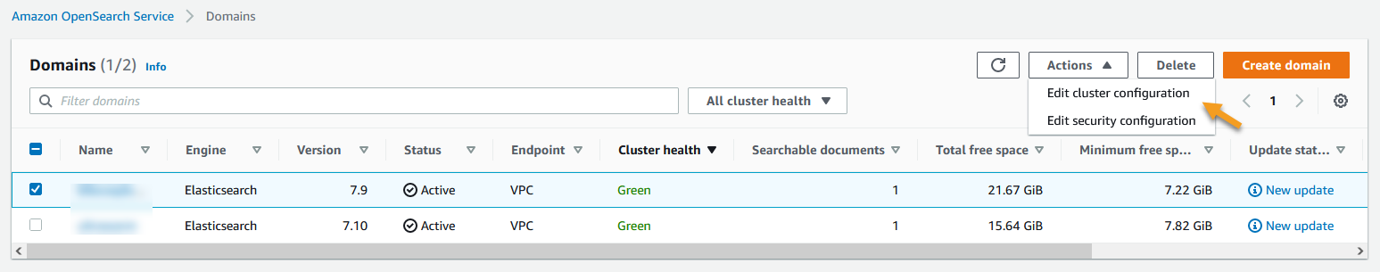 Go to Amazon OpenSearch Service console, select your “Domains” on the left menu, select your domain and click “Edit cluster configuration“.