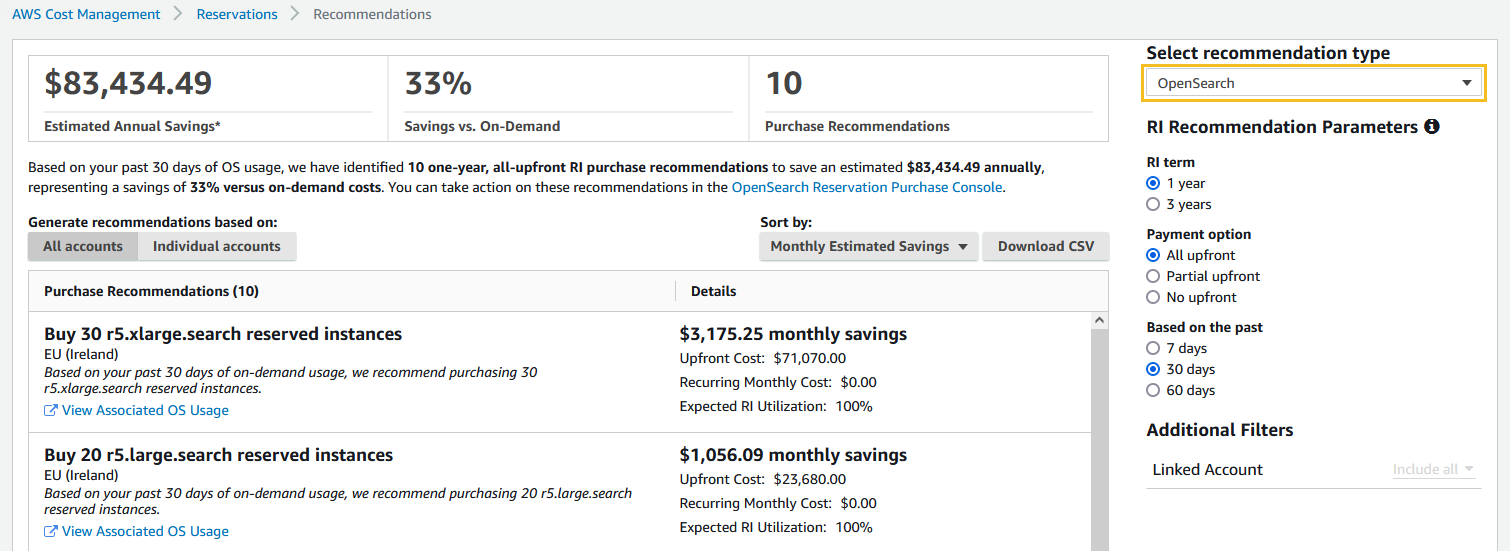 While reviewing the Cost Explorer Recommendations, you may notice that we do not give you recommendations for all your Amazon OpenSearch Service instance types, even if you are using all your clusters 100% of the time. Reason behind this is you can only buy RI on our newer instances generations. For a complete list of the instance types you can reserve, please have a look at our pricing page.