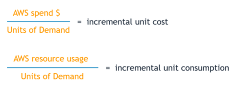 Finance and accounting teams would refer to the cost unit metric as “marginal cost”. A manufacturing professional may be familiar with the term “marginal consumption” or the amount of inputs (made or purchased) one would find on a bill of material. In the cloud, we’re going to use both of the marginal cost and marginal consumption versions of a unit metric as KPIs, so we can tell a complete story around whether or not our cloud spend is delivering more business value.