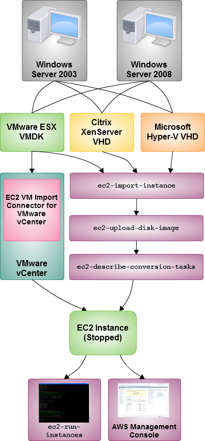 The first release of VM Import handled Windows 2008 images in the VMware ESX VMDK format. You can now import Windows 2003 and Windows 2008 images in any of the following formats: