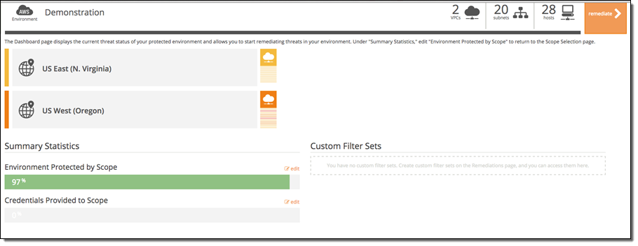 The topology view shows the relationship between your AWS assets, The relationships (lines between assets) are updated dynamically as your AWS environment changes. To complete your setup, you select the assets you want to be part of Cloud Insight’s continuous assessments. You can choose to protect an entire region, VPC, or subnet. You can make adjustments to this scope at any time.