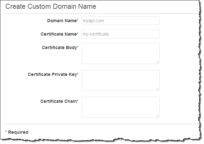 I can also create a custom domain name and expose the resulting URL as the preferred invocation URL for my service (all of this can be done via the Console, and is implemented via CloudFront):