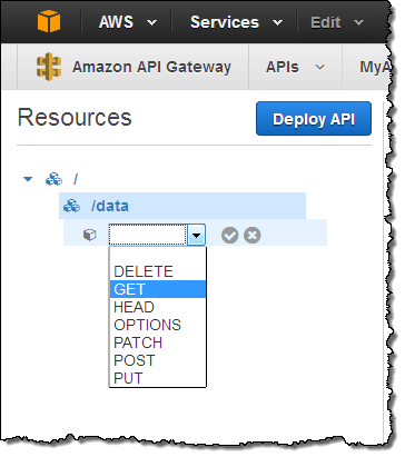 With the two functions ready, I can now create the methods on the resource and attach them to the code. I return to the API Gateway Console, click on Create Method, and choose an HTTP method: