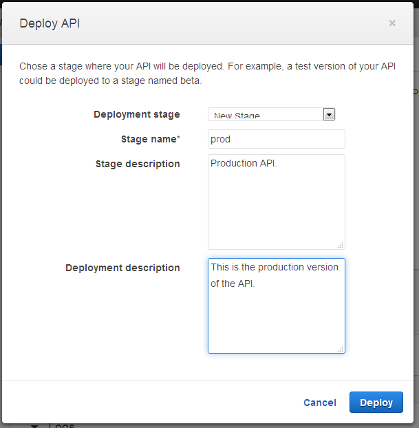 Once I am happy with my API I can deploy it so that others can make use of it. To do this I simply click on the Deploy API button, and then choose a stage. The stage becomes part of the API’s URL; it allows me to have multiple, parallel deployments (staging, beta, production, and so forth) that are isolated and independent of each other. Here’s how I create a stage called prod (for production):