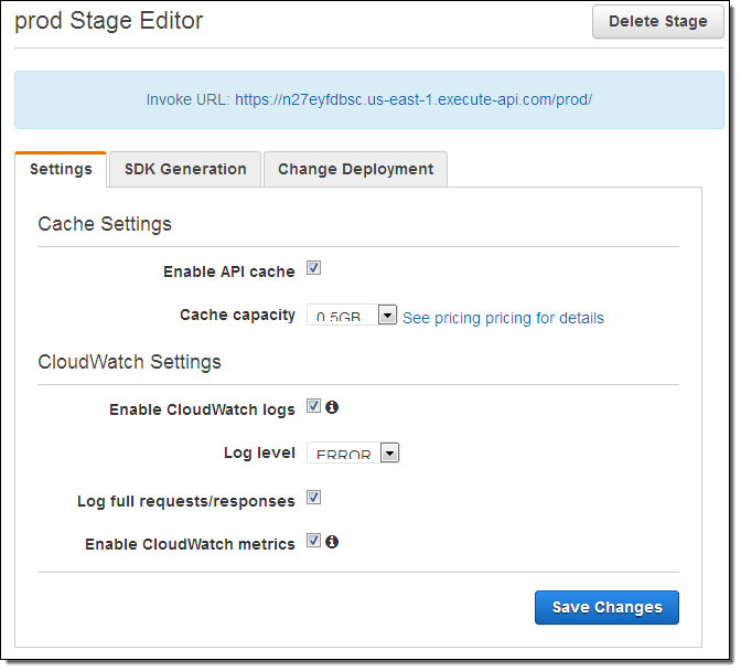 Then I have the opportunity to set some options for the stage. I can opt to log API calls to CloudWatch Logs and to send per-metric metrics to CloudWatch. I can also indicate that every call to the API must include an API key in order for it to be accepted: