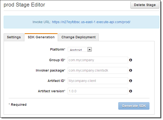 As you can see, the Console displays the invocation URL for the API. It also gives me the option to generate an SDK for it: