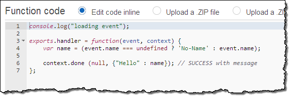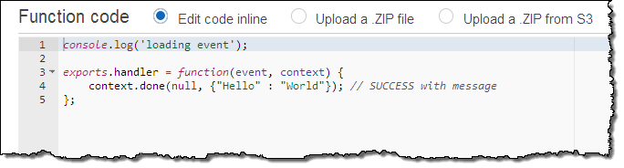 Now I need some actual code. I switch over to the Lambda Console and create a pair of functions that will serve as implementations of methods on the /data resource. The first function is called GetHelloWorld. It takes no inputs and returns a very simple constant JSON object. Here’s the code: