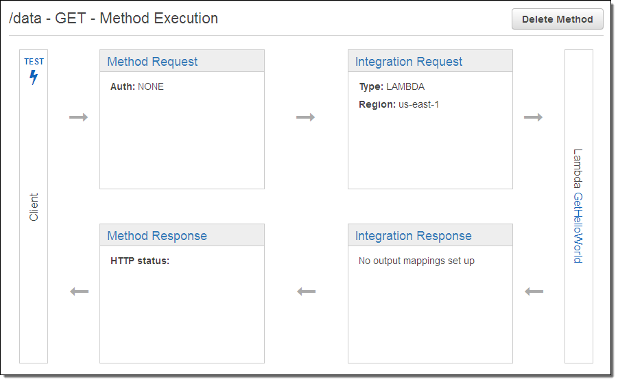 The connection between my resource definition (the resource name and the HTTP method) and some code is called an Integration Request. As you have already seen, the request can be routed to a Lambda function with a couple of clicks. It can also be routed to an arbitrary HTTP endpoint (running on EC2 or at any public accessible location). Along the way, the request can be mapped to a different HTTP method (changing a GET to a POST, for example) and an API Gateway Model can be used to transform the input into the form required by the service running at the endpoint. Models are specified using JSON-Schema and can be set up using the Console.
