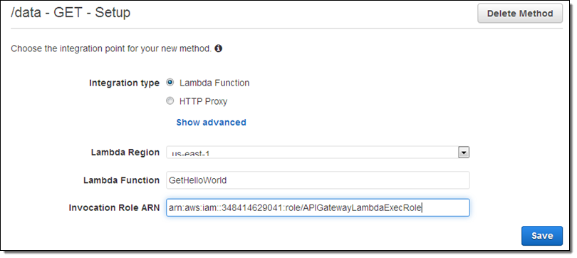 I can create multiple methods (one per HTTP verb) on any of my resources. I’ll choose GET, and then designate a Lambda function as my Integration Type (we’ll talk about the other ones later on):