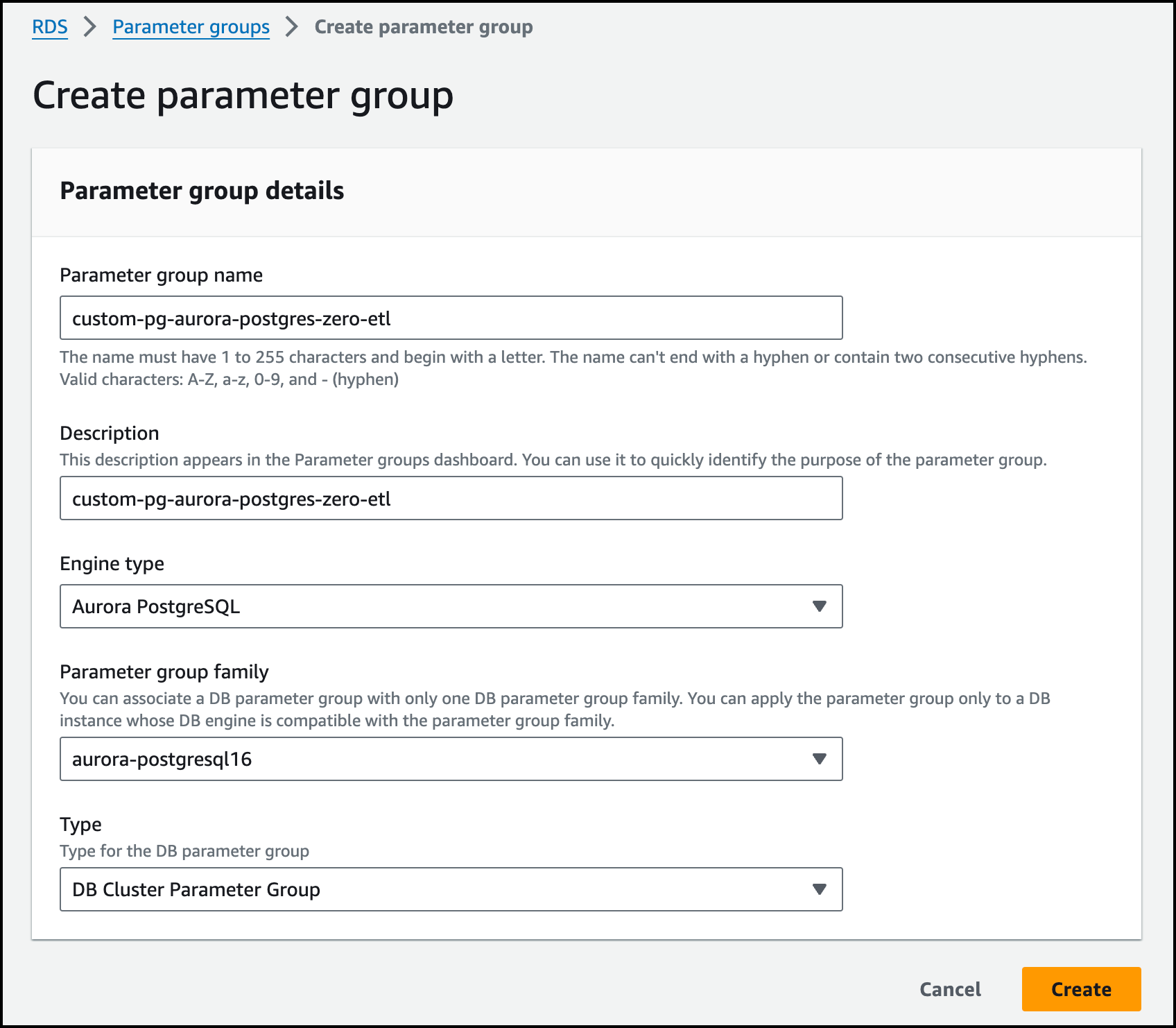 I enter custom-pg-aurora-postgres-zero-etl for Parameter group name and Description. I choose Aurora PostgreSQL for Engine type and aurora-postgresql16 for Parameter group family (zero-ETL integration works with PostgreSQL 16.4 or above versions). Finally, I choose DB Cluster Parameter Group for Type and choose Create.