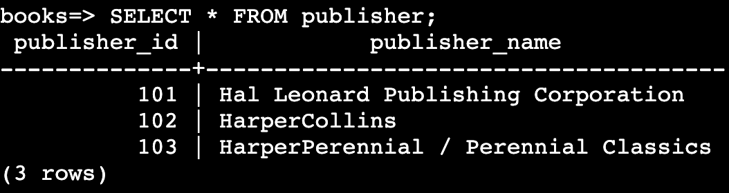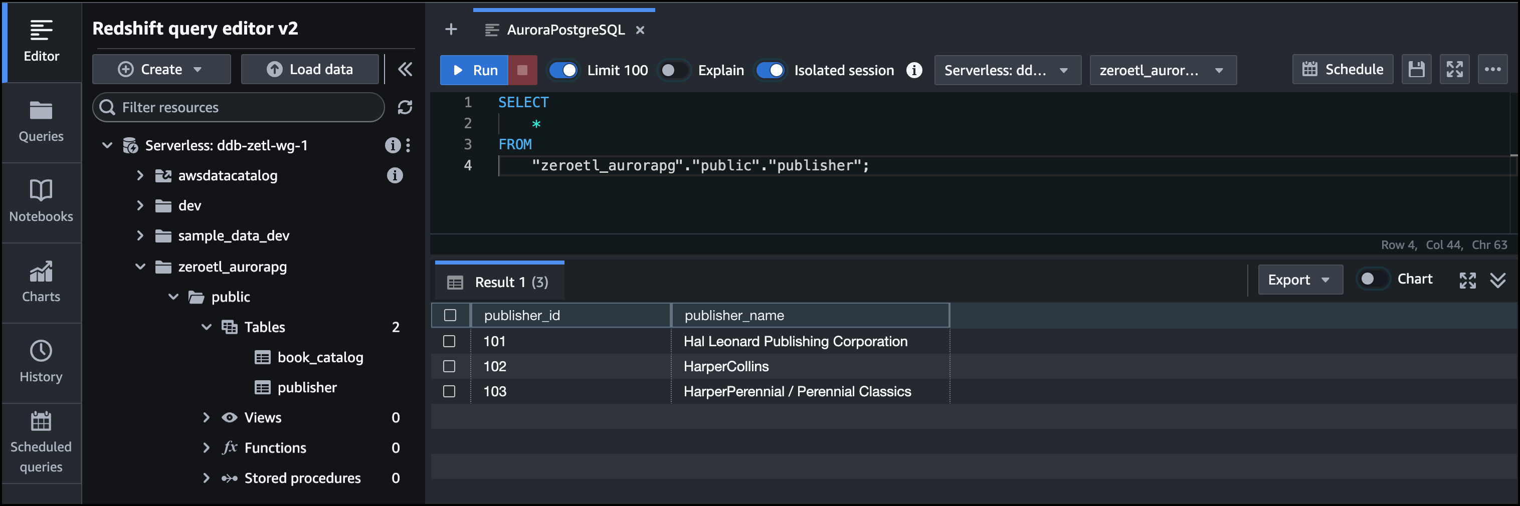 When I switch to the Amazon Redshift Query editor and refresh the tables, I can see that the new publisher table and its records are replicated to the data warehouse.