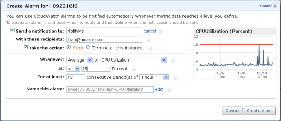You could also implement a failsafe that would detect runaway instances (for example, CPU pegged at 100% for an extended period of time). Perhaps your application gets stuck in a loop from time to time (only when you are not looking, of course). You could also use our CloudWatch monitoring scripts to detect and act on other situations, such as excessive memory utilization).