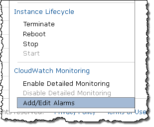 You can set up alarm actions from the EC2 or CloudWatch tabs of the AWS Management Console. Let’s say you want to start from the EC2 tab. Right-click on the instance of interest and choose Add/Edit Alarms: