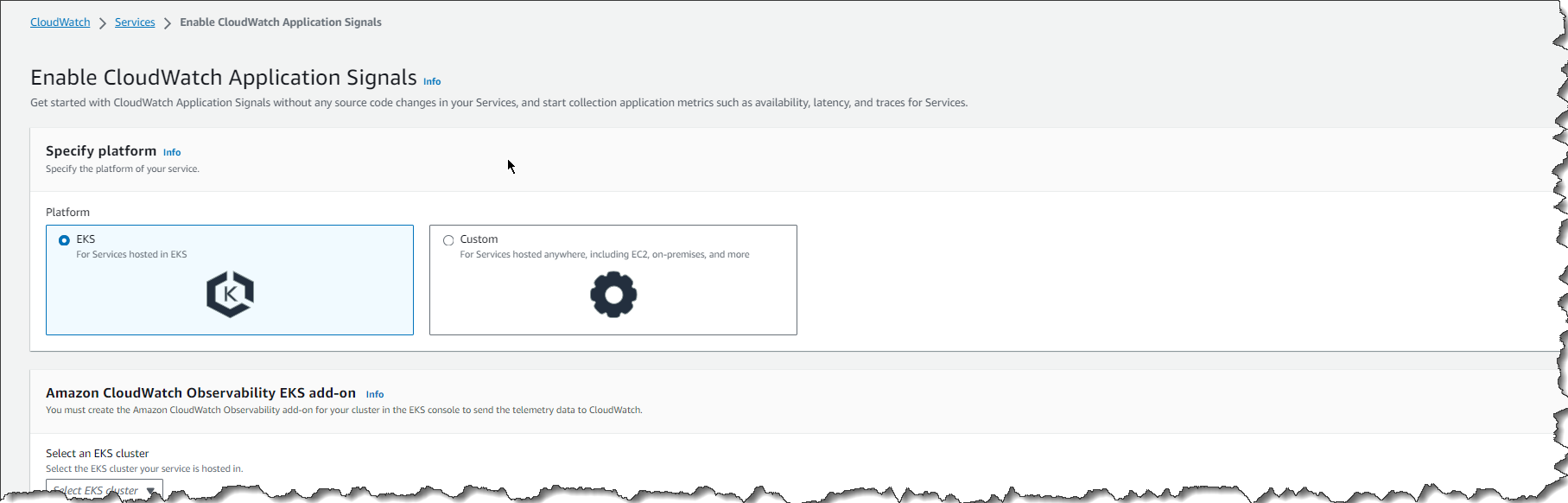 After enabling Application Signals via the Amazon EKS add-on or Custom option for other compute types, Application Signals automatically discovers services and generates a standard set of application metrics such as volume of requests and latency spikes or availability drops for APIs and dependencies, to name a few.