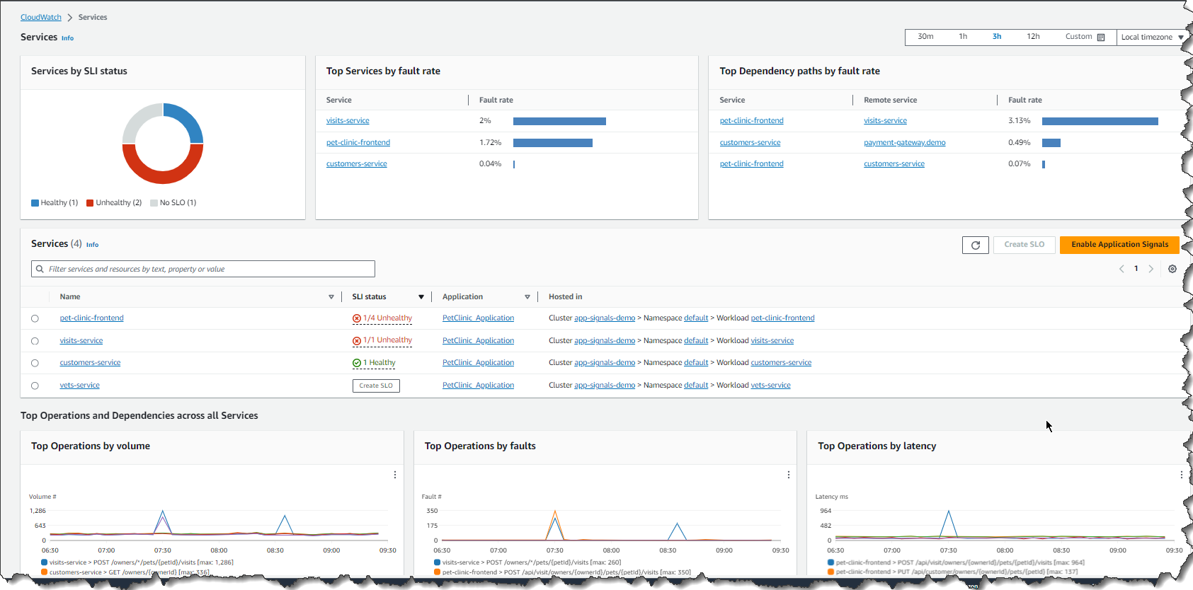 Amazon CloudWatch Application Signals helps you automatically instrument applications based on best practices for application performance. There is no manual effort, no custom code, and no custom dashboards. You get a pre-built, standardized dashboard showing the most important metrics, such as volume of requests, availability, latency, and more, for the performance of your applications. In addition, you can define Service Level Objectives (SLOs) on your applications to monitor specific operations that matter most to your business. An example of an SLO could be to set a goal that a webpage should render within 2000 ms 99.9 percent of the time in a rolling 28-day interval.