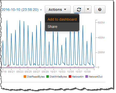 The Actions column on the right lets me create alarms, duplicate a metric, or to delete it from the graph.