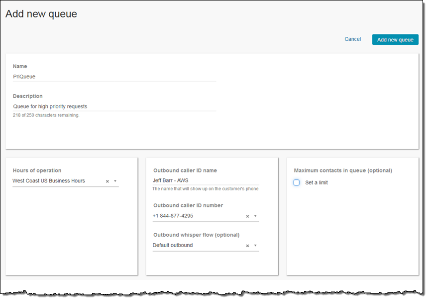 Now I can create queues to model the routing of contacts (incoming calls) to agents. Queues can represent priorities (different levels of regular and premium support), or agents with different business or language skills.
