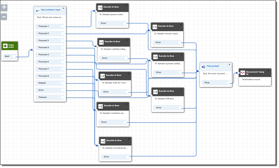 Flexible – The Contact Flow Editor (CFE) that powers Connect includes blocks for interaction, integration, control flow, branching, and more. Call flows can include a mixture of prerecorded audio prompts, generated audio, Lex-powered interaction, integration with existing systems and databases, conversations with agents, call transfers, and more.