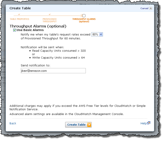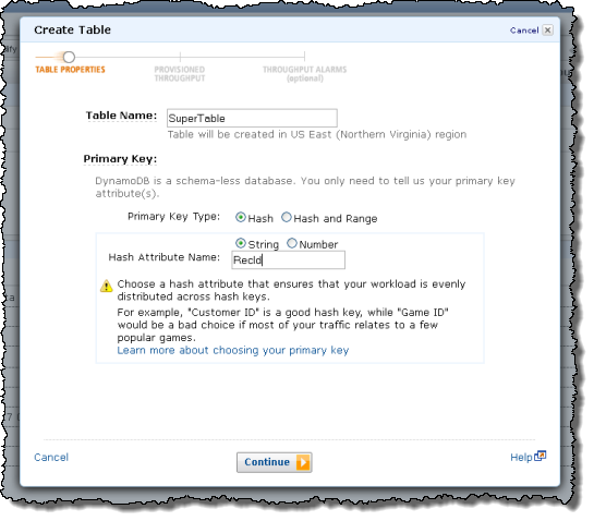 The AWS Management Console has a new DynamoDB tab. You can create a new table, provision the throughput, set up the index, and configure CloudWatch alarms with a few clicks: