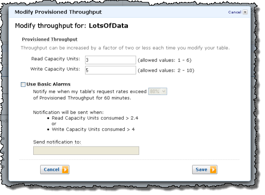 DynamoDB works on the basis of provisioned throughput. When you create a DynamoDB table, you simply tell us how much read and write throughput you need. Behind the scenes we’ll set things up so that we can meet your needs, while maintaining latency that’s in the single-digit milliseconds. Later, if your needs change, you can simply turn the provisioned throughput dial up (or down) and we’ll adjust accordingly. You can do this online, with no downtime and with no impact on the overall throughput. In other words, you can scale up even when your database is handling requests.