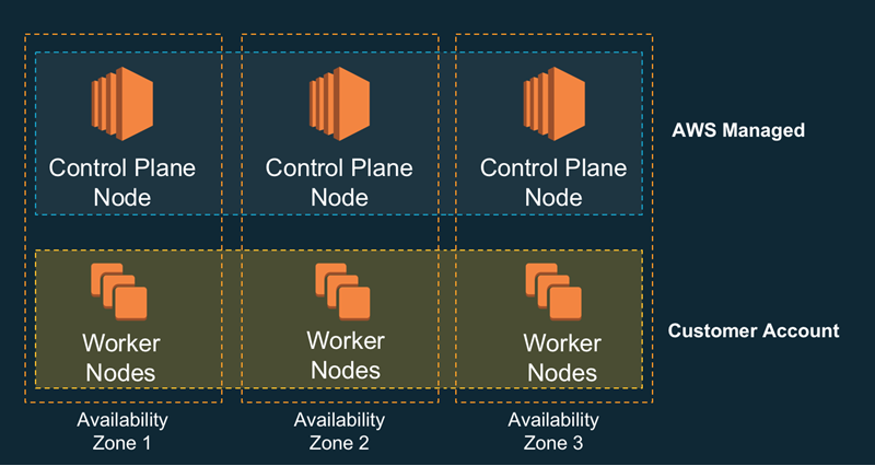 Multi-AZ – The Kubernetes control plane (the API server and the etcd database) are run in high-availability fashion across three AWS Availability Zones. Control plane nodes are monitored and replaced if they fail, and are also patched and updated automatically.